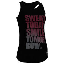 This is great comfortable top for fitness. The cut is good, sizing is good, the fabric is nice and light and doesn't get sweaty. I really like this top and have got it in the whole range of colours. The only reason I didn't give it 5* is because no one can actually work out what it says and I've have had people staring at my chest for a little longer than they should!