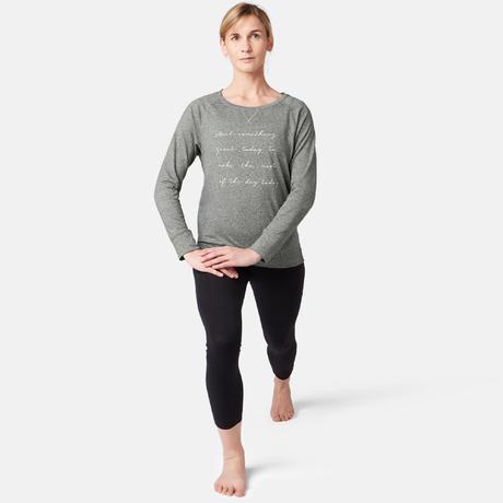 500 Women's Long-Sleeved Pilates & Gentle Gym T-Shirt - Grey Print