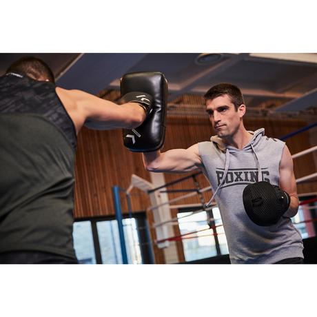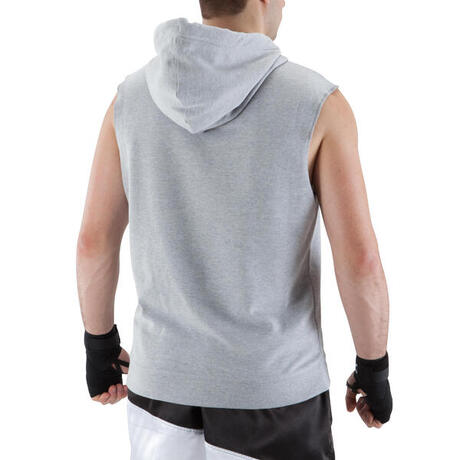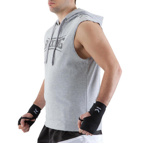 The hooded tank top for boxing warm-ups. Wide cut at the shoulders provides ample freedom of movement. Includes a hood to keep you warm when not moving.