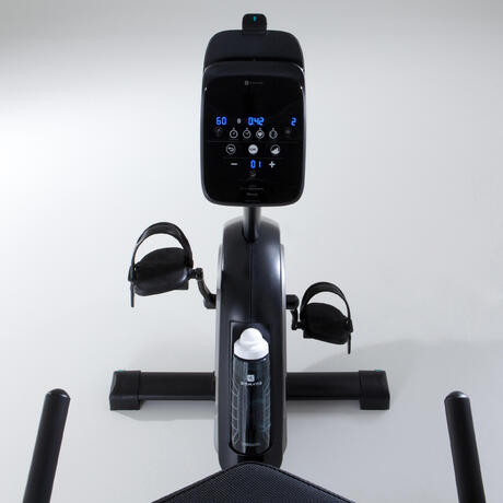 The Domyos E SEAT recumbent exercise bike console displays: